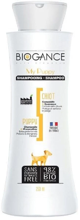 Le shampooing pour chiot de Biogance est un shampoing tout doux pour votre petit chien. Il est formulé à base de Camomille et de Guimauve afin d’assurer un nettoyage en douceur, une protection optimale et de protéger la peau et le pelage. Sa composition est fabriquée en France, sans paraben, au pH neutre et contient 98% d’ingrédients naturelle et bio. Le shampoing parfait pour que votre chiot est un pelage doux et soyeux.