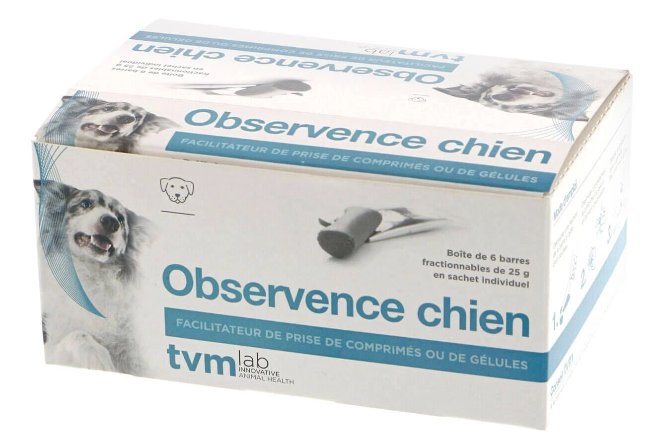 OBSERVENCE Chien est un aliment complémentaire qui permet d’enrober et de dissimuler comprimés ou gélules pour en faciliter la prise. L’odeur et la saveur correspondent parfaitement au goût du chien et la texture empêche l’animal de dissocier le comprimé ou la gélule de la boulette formée.