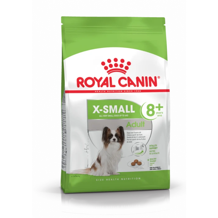 ROYAL CANIN® X-Small Adult 8+ est spĂ©cialement formulĂ© pour rĂ©pondre Ă tous les besoins nutritionnels de votre petit chien adulte, et convient aux très petits chiens de plus de 8 ans qui pèsent jusqu’Ă 4 kg.